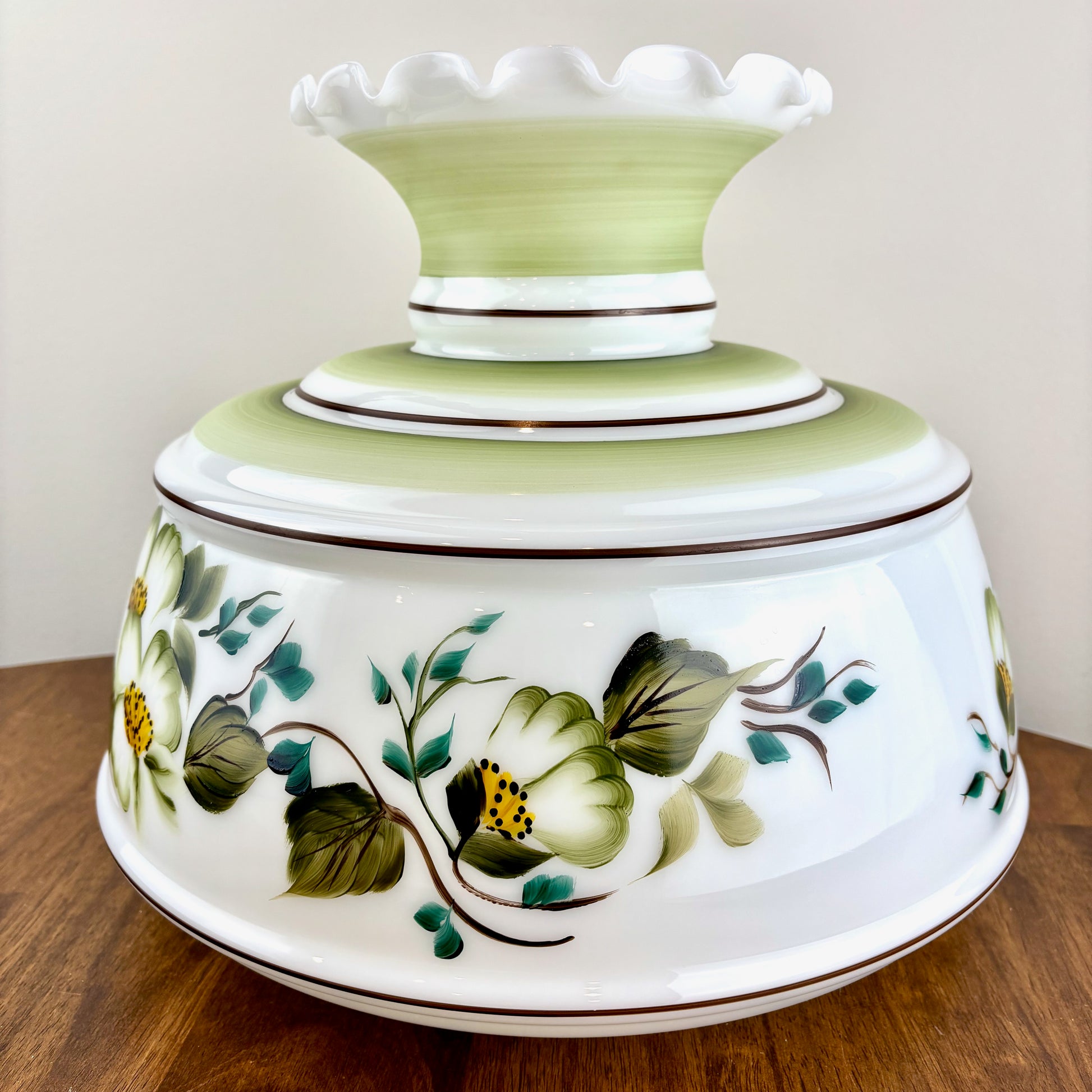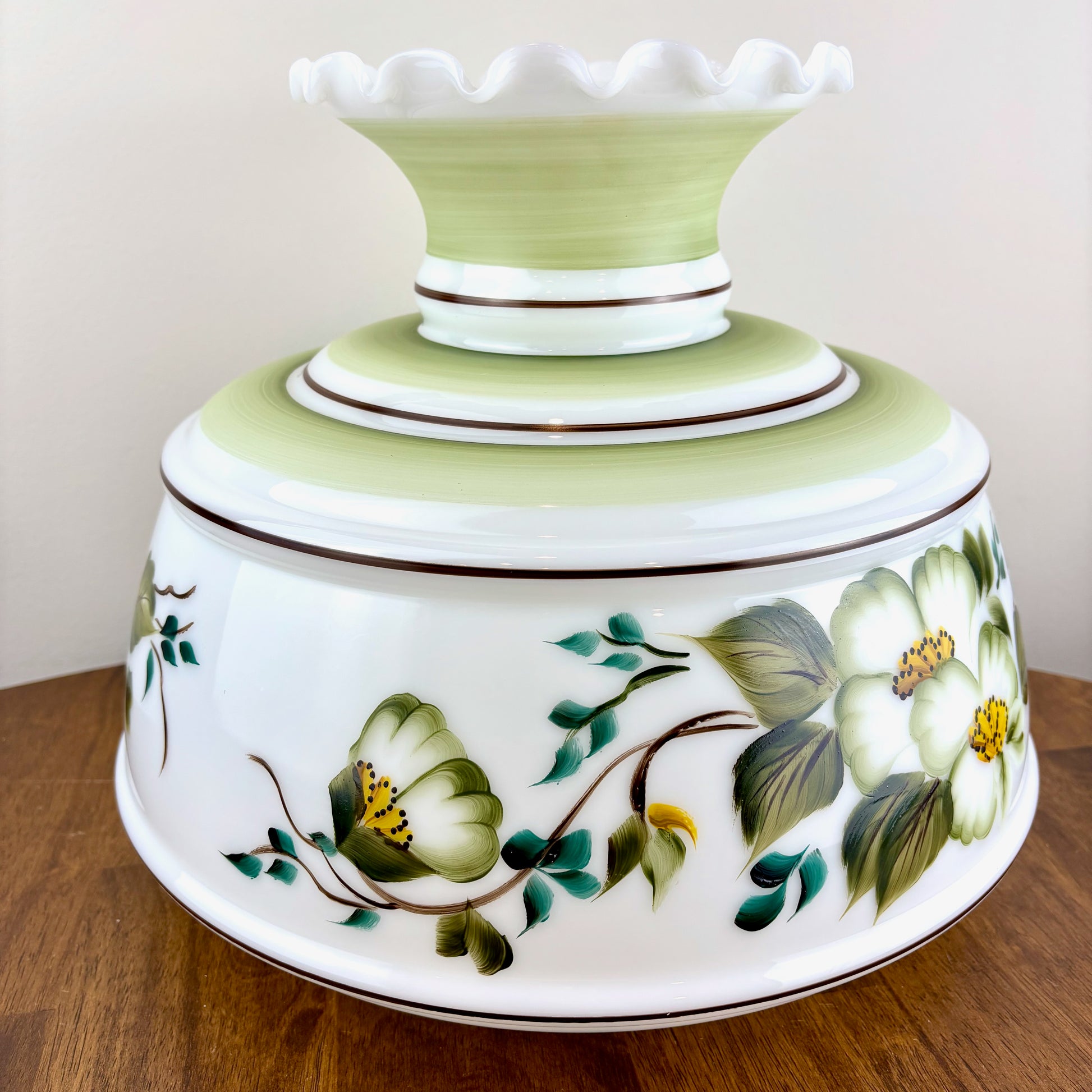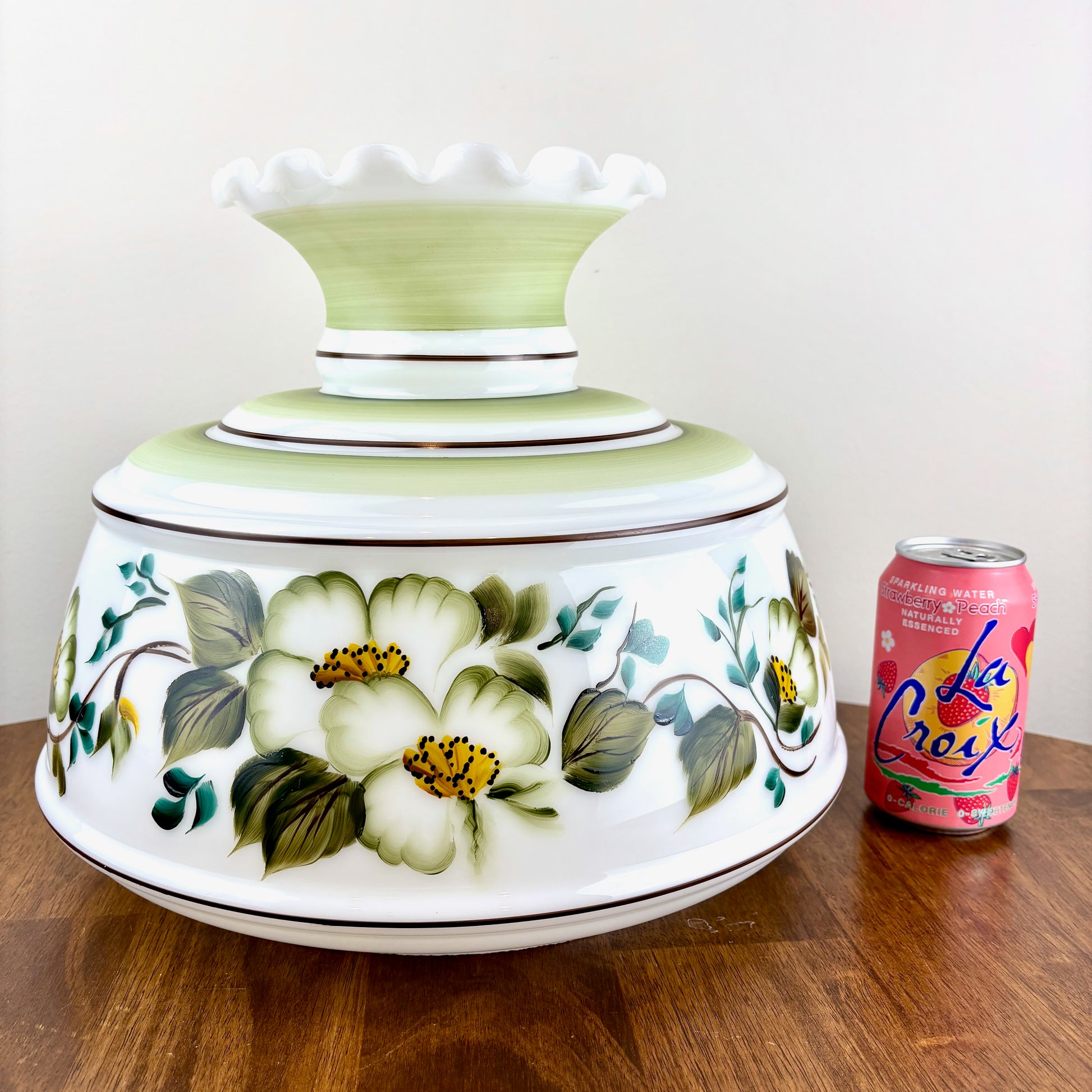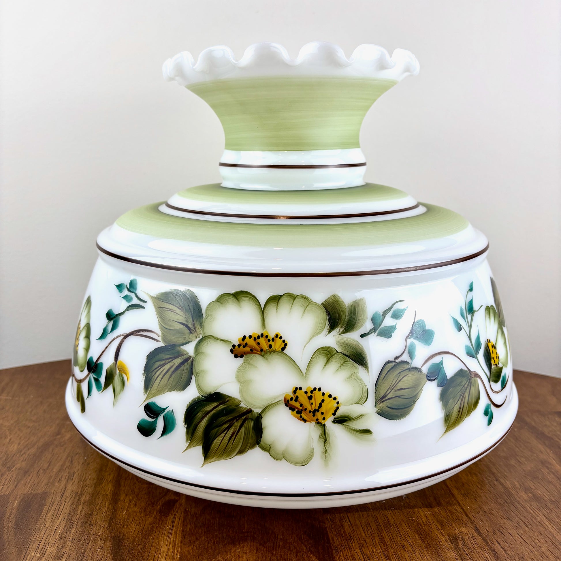 Vintage Hurricane Lamp Shade | Large Quoizel Green Floral Brown Trim Hurricane Shade | 10 Inch Fitter | Glass Lamp Shade | Glass Shade