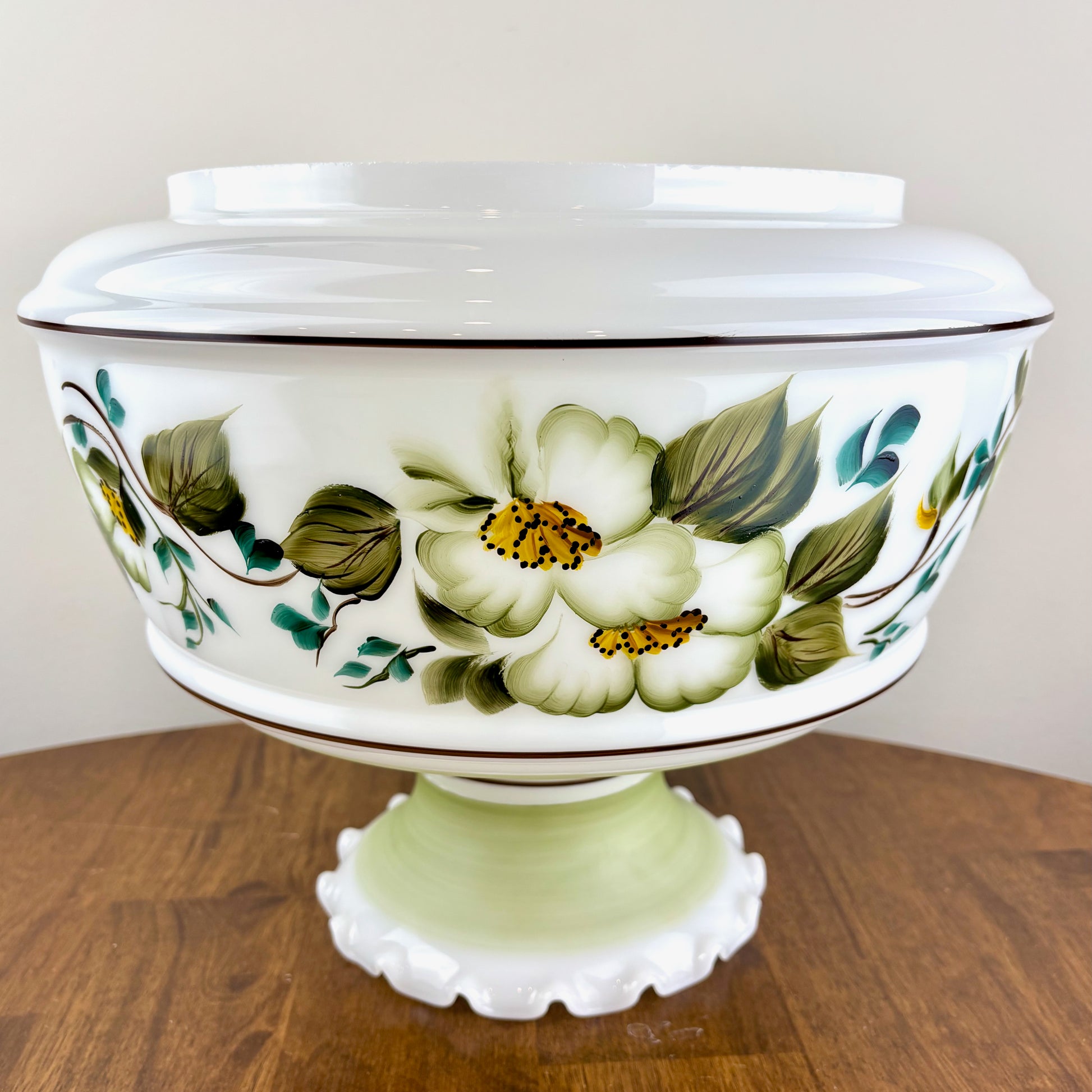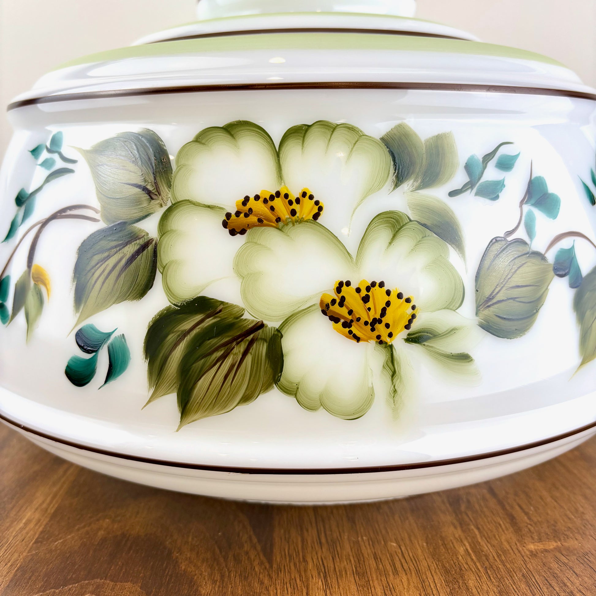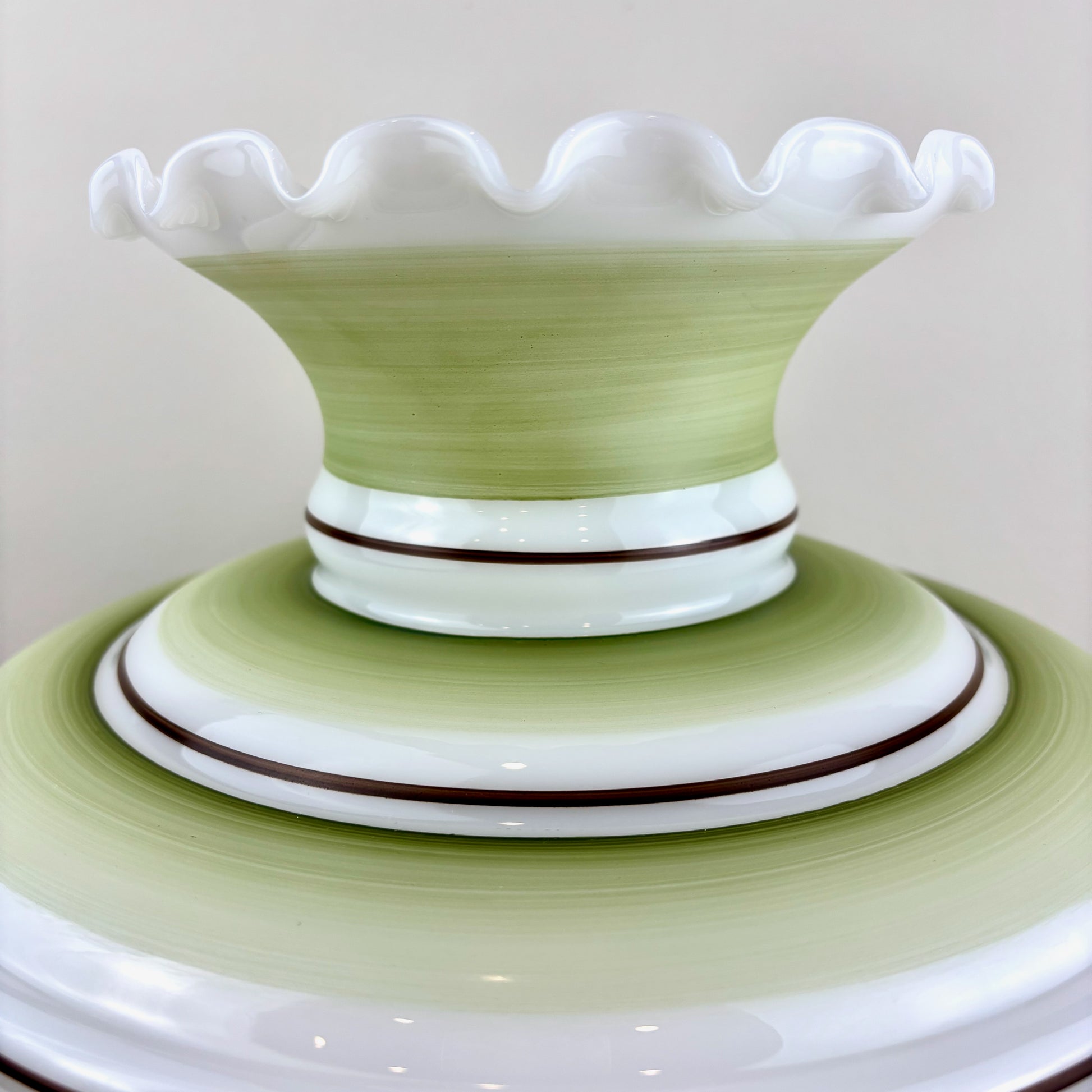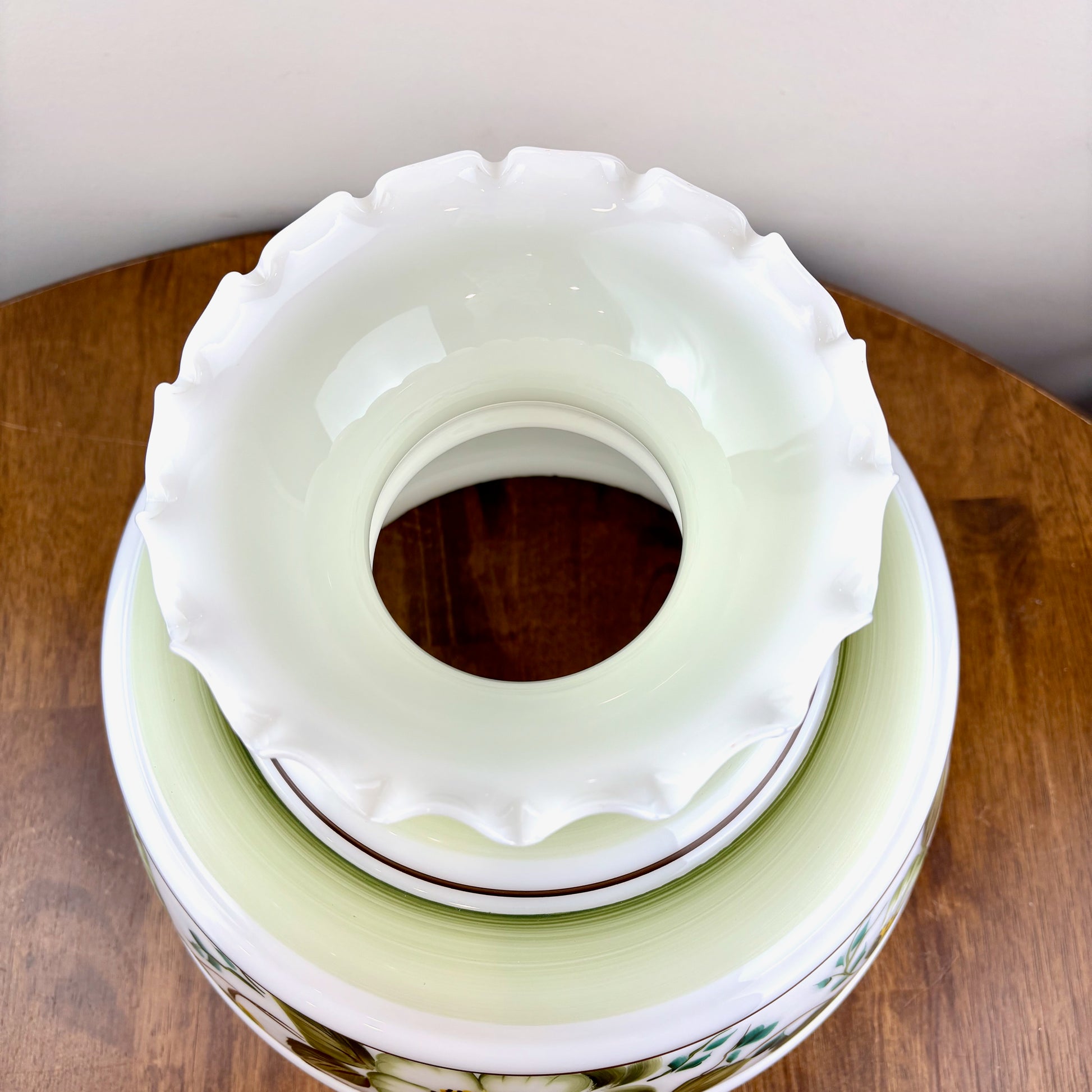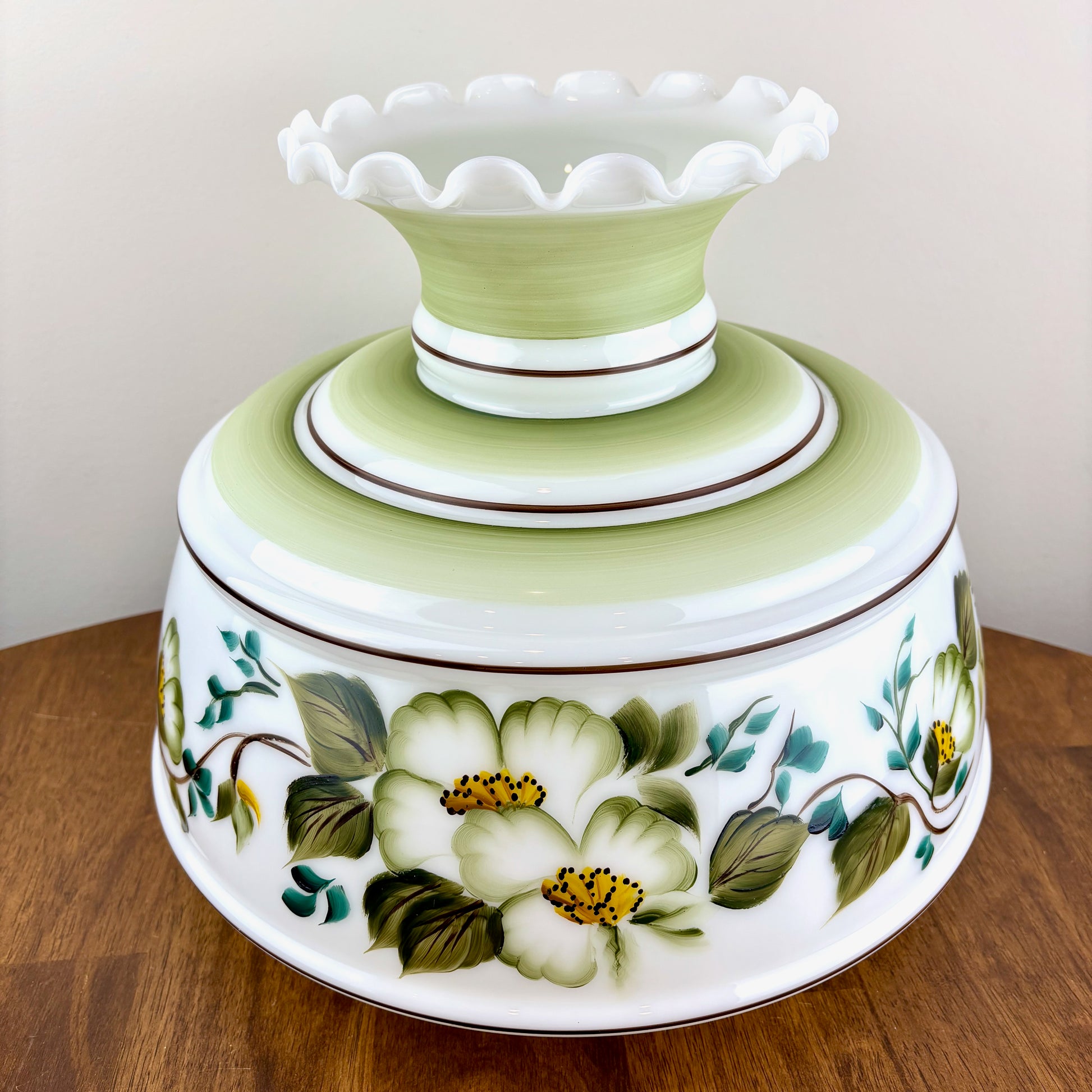 Vintage Hurricane Lamp Shade | Large Quoizel Green Floral Brown Trim Hurricane Shade | 10 Inch Fitter | Glass Lamp Shade | Glass Shade