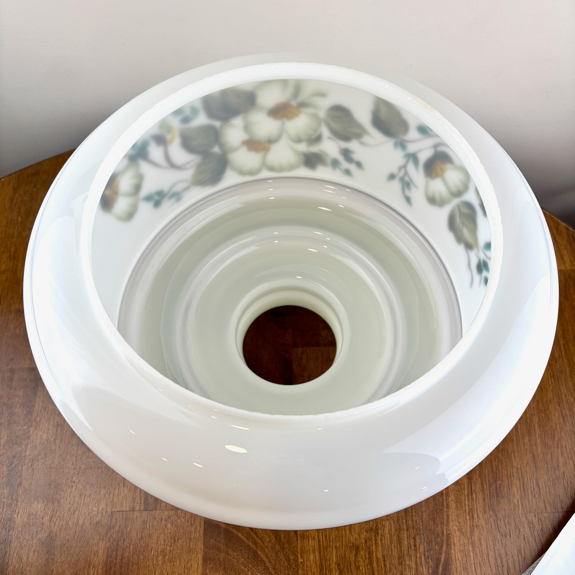 This beautiful lamp shade is in great vintage condition. There is roughness along the bottom glass fitter rim, which is common in glass shades. The wear can't be seen once the glass shade is in the fitter rim.