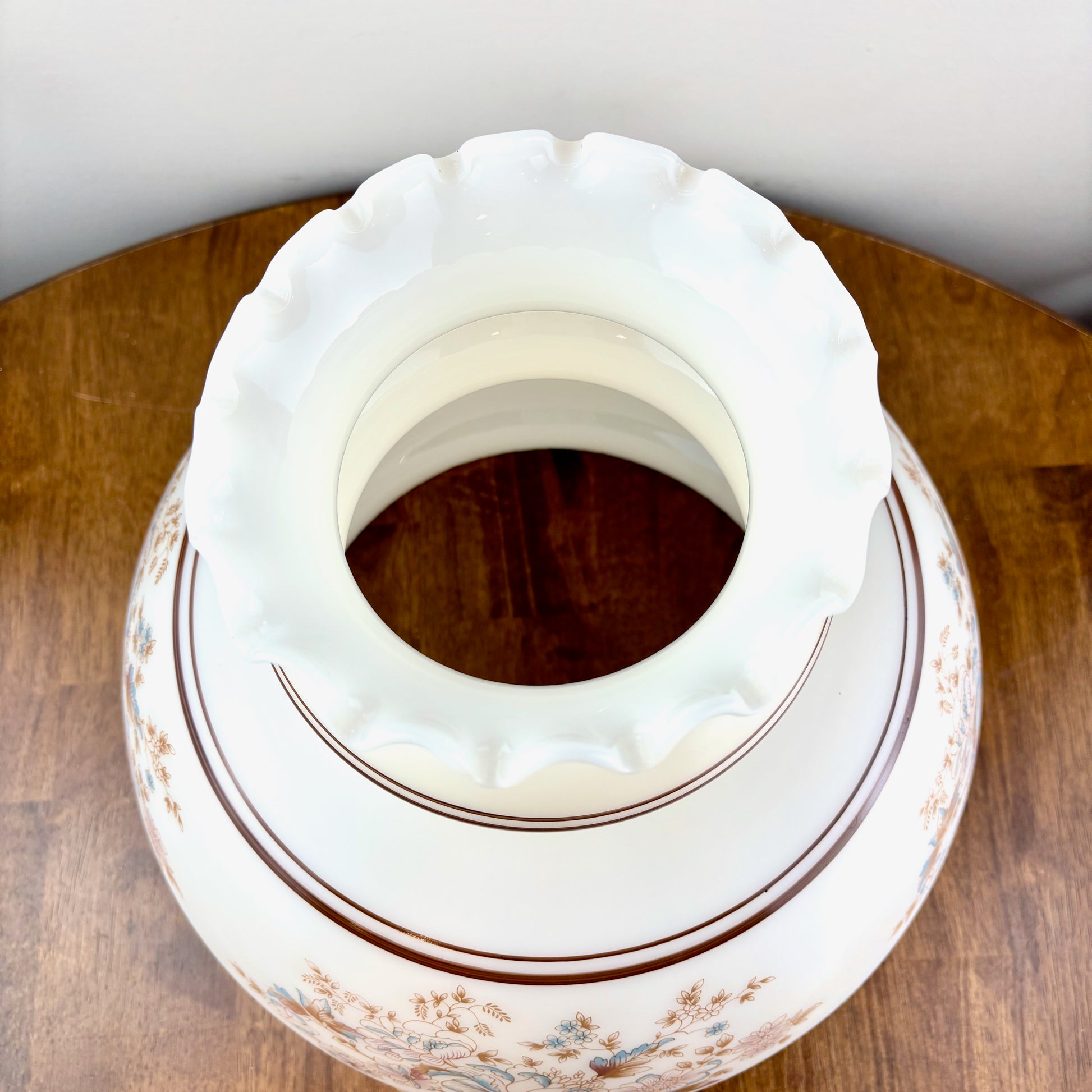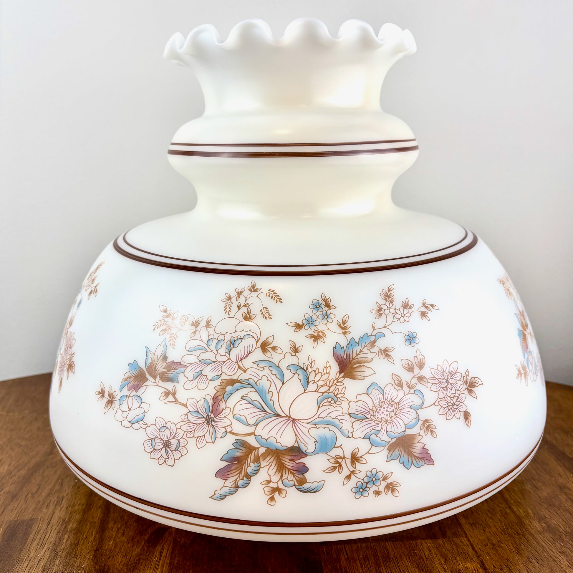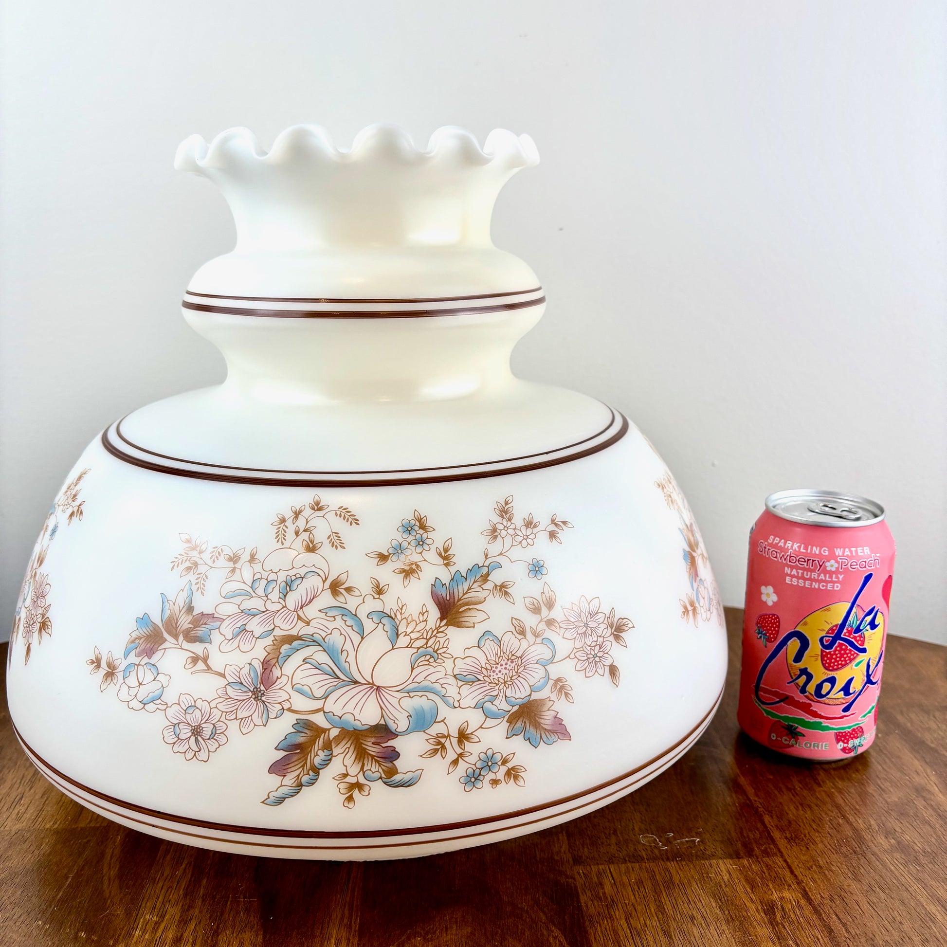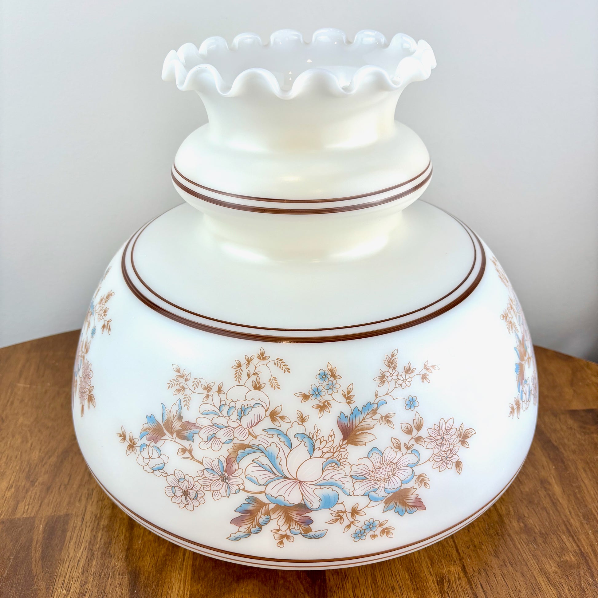 Vintage Hurricane Lamp Shade | Large Quoizel White Blue Floral Brown Trim Hurricane Shade | 10 Inch Fitter | Glass Lamp Shade | Glass Shade