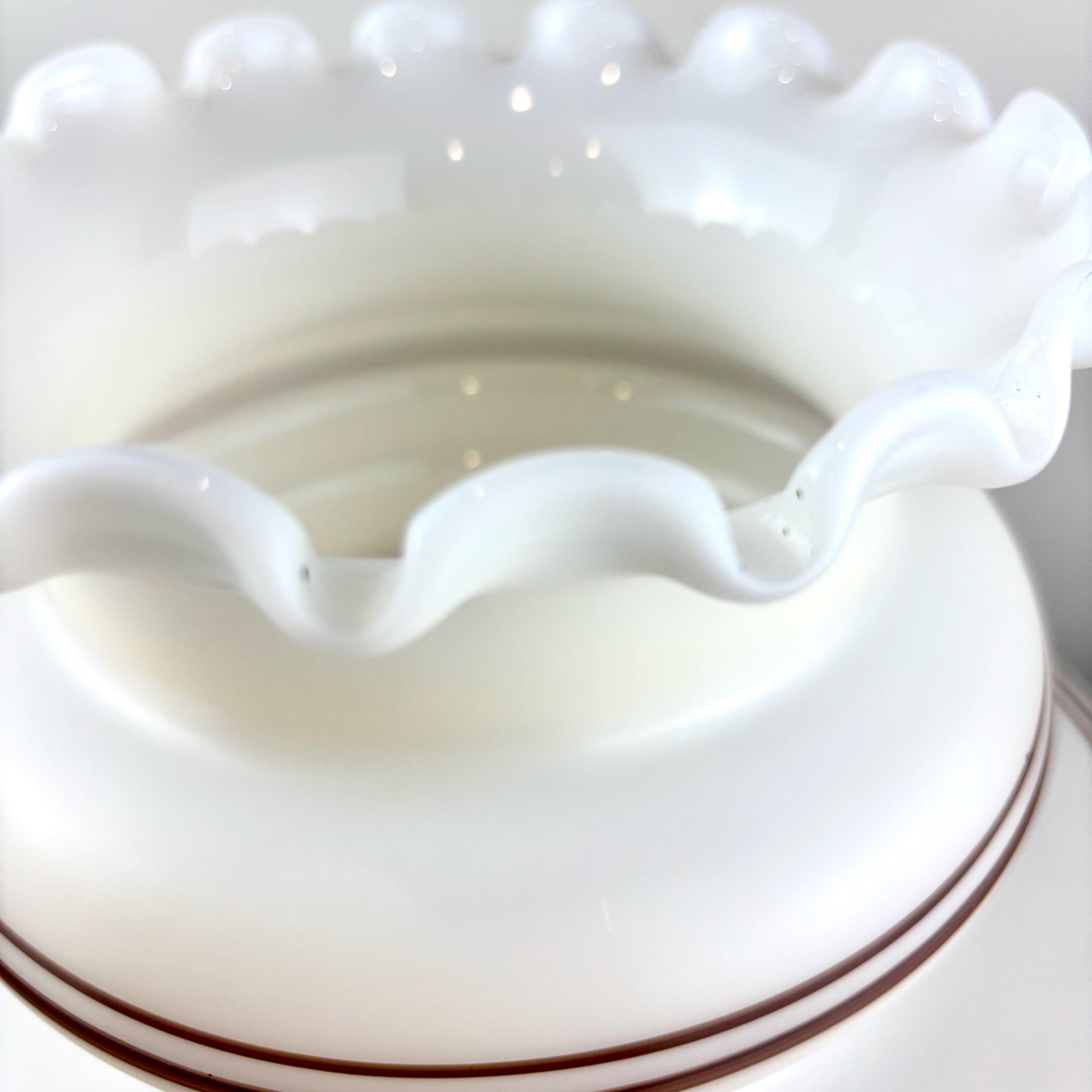 This beautiful lamp shade is in great vintage condition. There is roughness along the bottom glass fitter rim, which is common in glass shades. The wear can't be seen once the glass shade is in the fitter rim. There are tiny marks on the top ruffles. Please see the last photo for an example of wear.