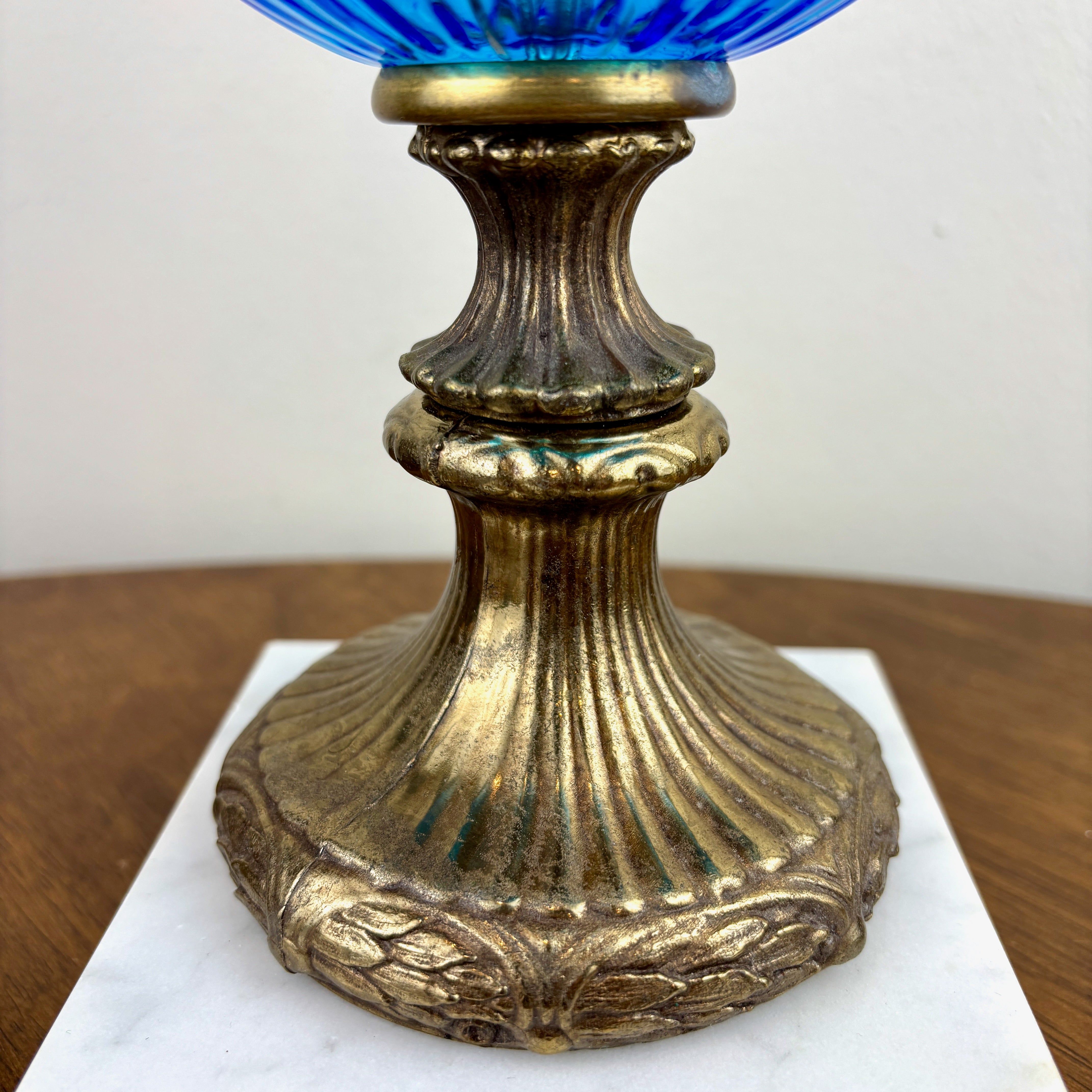 This lamp is in great vintage condition. The bottom inside rim around the shade has chipping, but there are no chips on the outside rim of the shade. There are some tiny chips on the marble base. The shade has some lines in the glass from the manufacturing process, but you have to be right next to the lamp to see the lines. Metal has light patina. Please see the last 3 photos for some examples of wear.