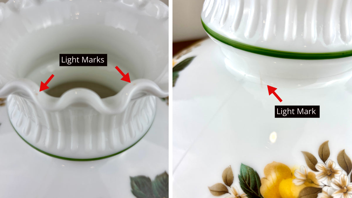 This glass shade is in great vintage condition with no chips or cracks. The shade has some light marks in the glass. Please see the last photo for an example of wear.