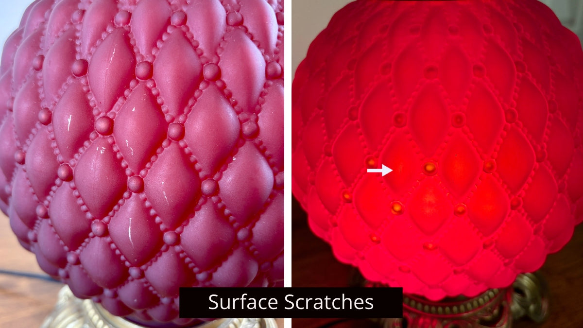 This nightlight lamp is in great vintage condition. The ruby red glass does have expected age wear with light surface scratches around the globe and a glass blister. The glass blister doesn't go through the glass. When the nightlight lamp is lit, you can barely see the imperfections. You have to be right next to the lamp to see the wear. Please see the last 2 photos for some examples of wear in the daylight and when the lamp is lighted.