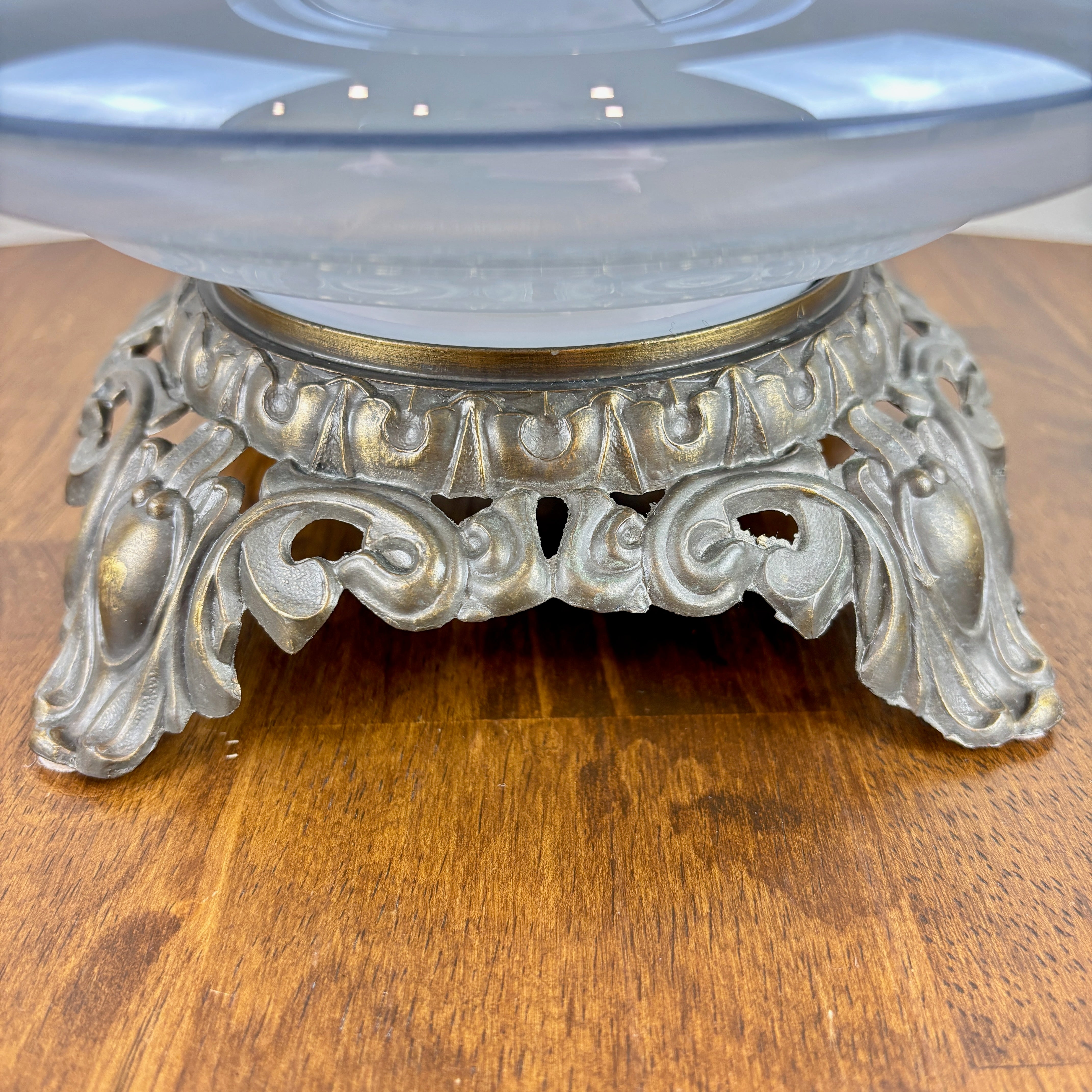 This lamp is in great vintage condition with no chips or cracks. The lamp has lines in the glass from the manufacturing process. Metal has light patina.