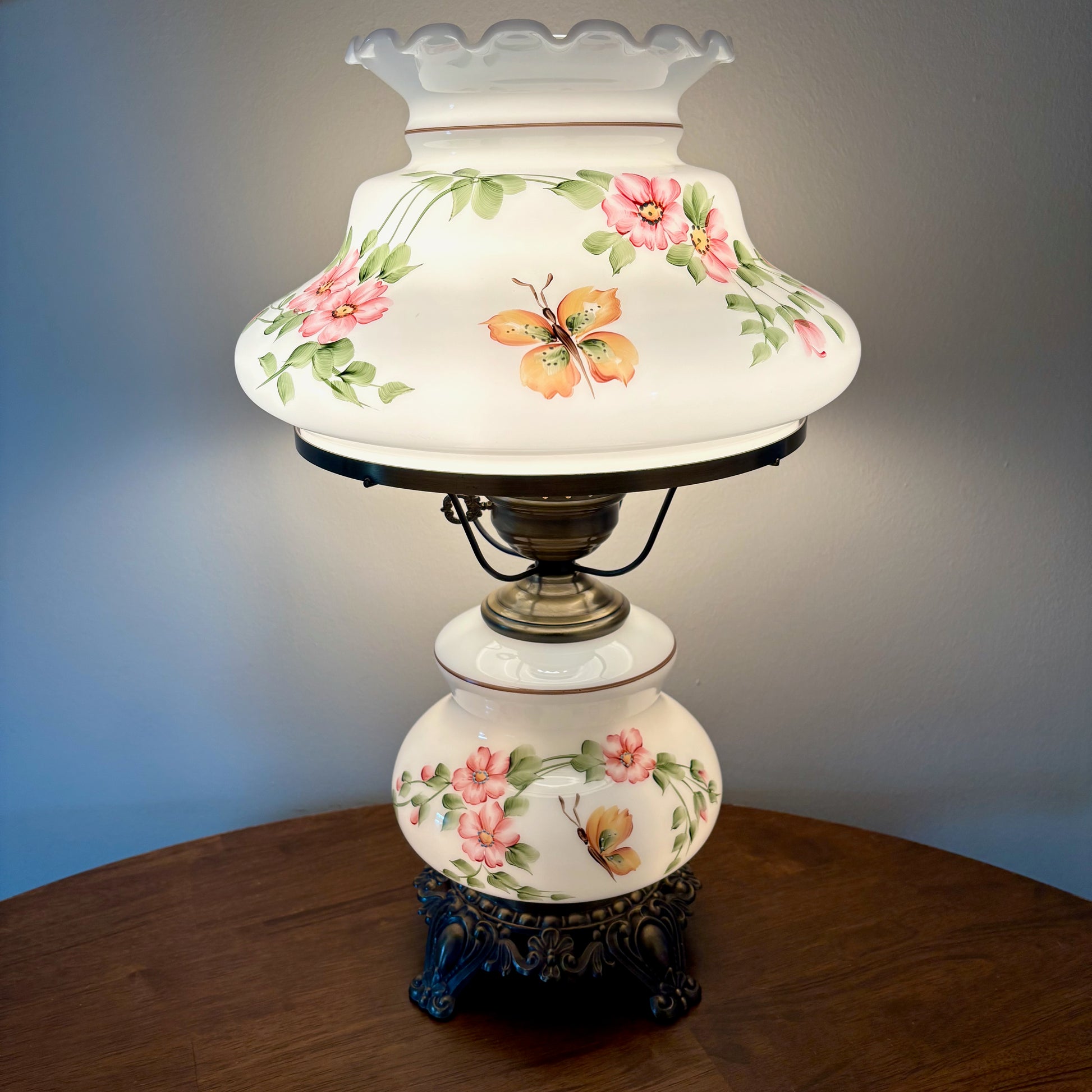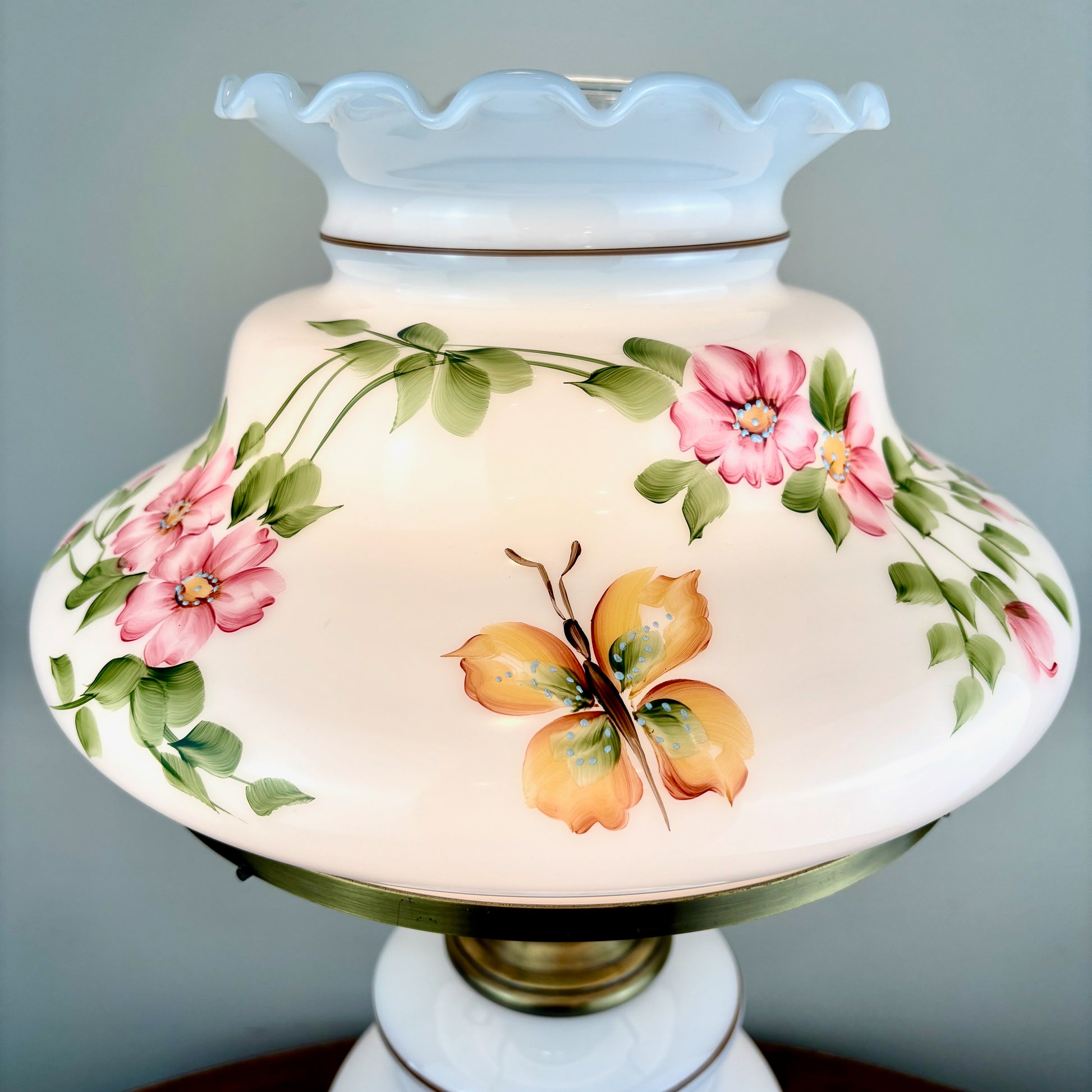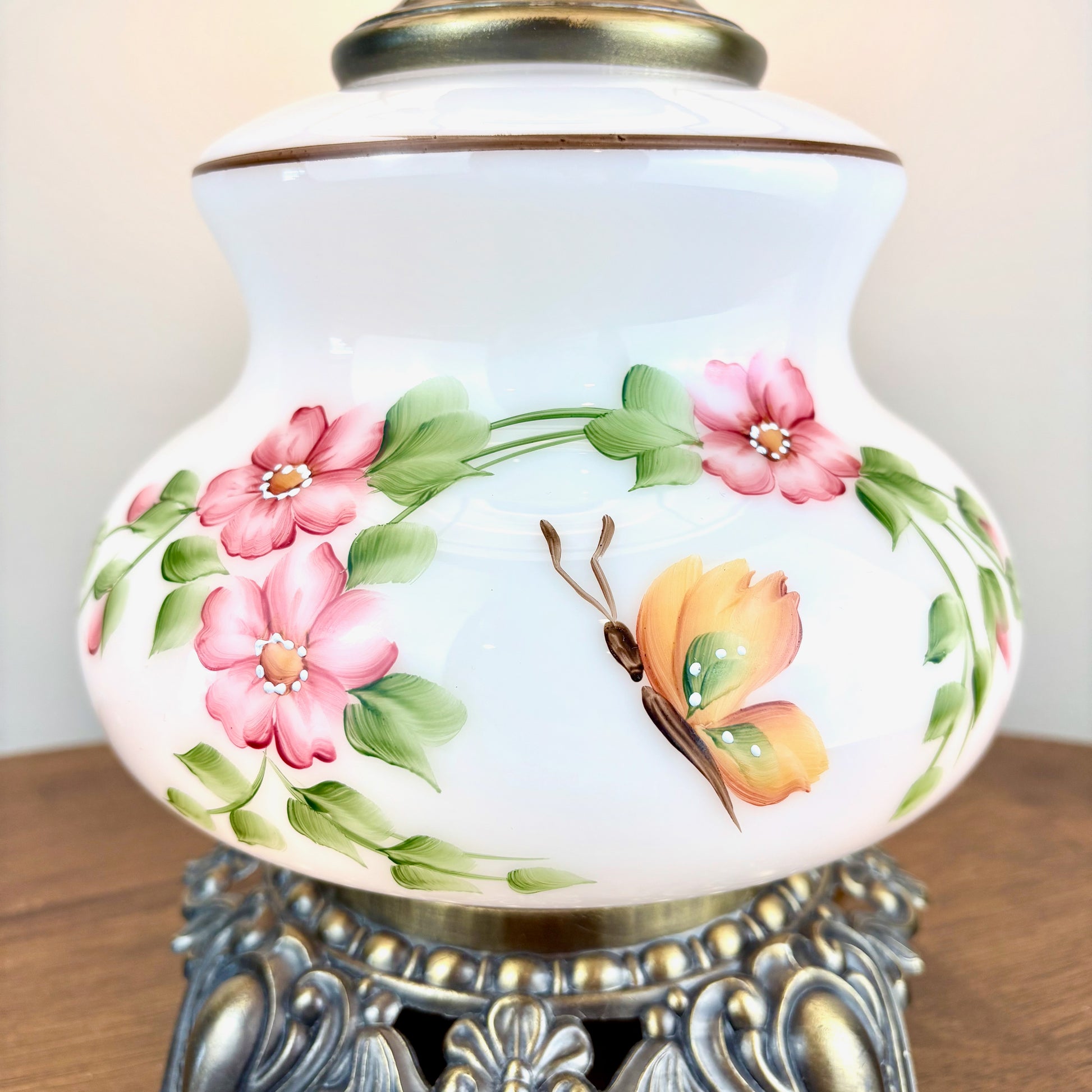 Beautiful milk glass hurricane lamp with hand painted butterflies and pink florals.