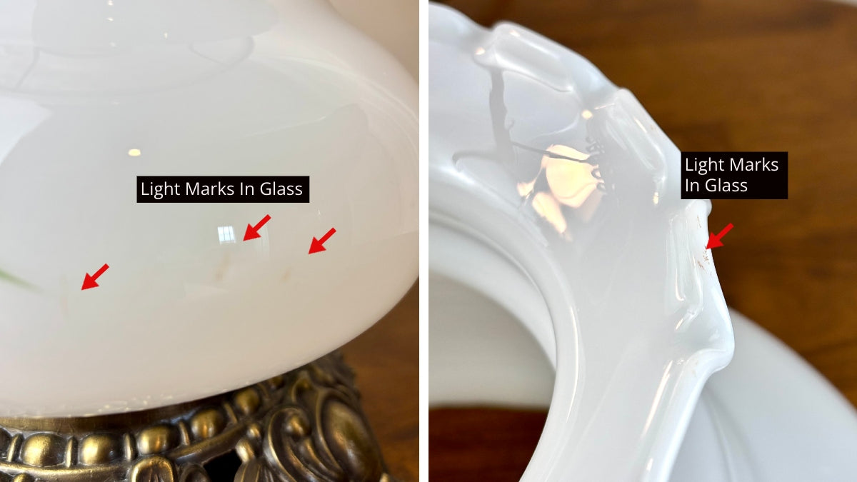 This lamp is in great vintage condition with no chips or cracks. There is roughness along the bottom shade fitter rim, which is common in glass shades. The shade has some light marks on the top ruffles and the glass base has some light marks on the side and in the back of the glass. Metal has light patina. Please see the last photo for an example of wear.
