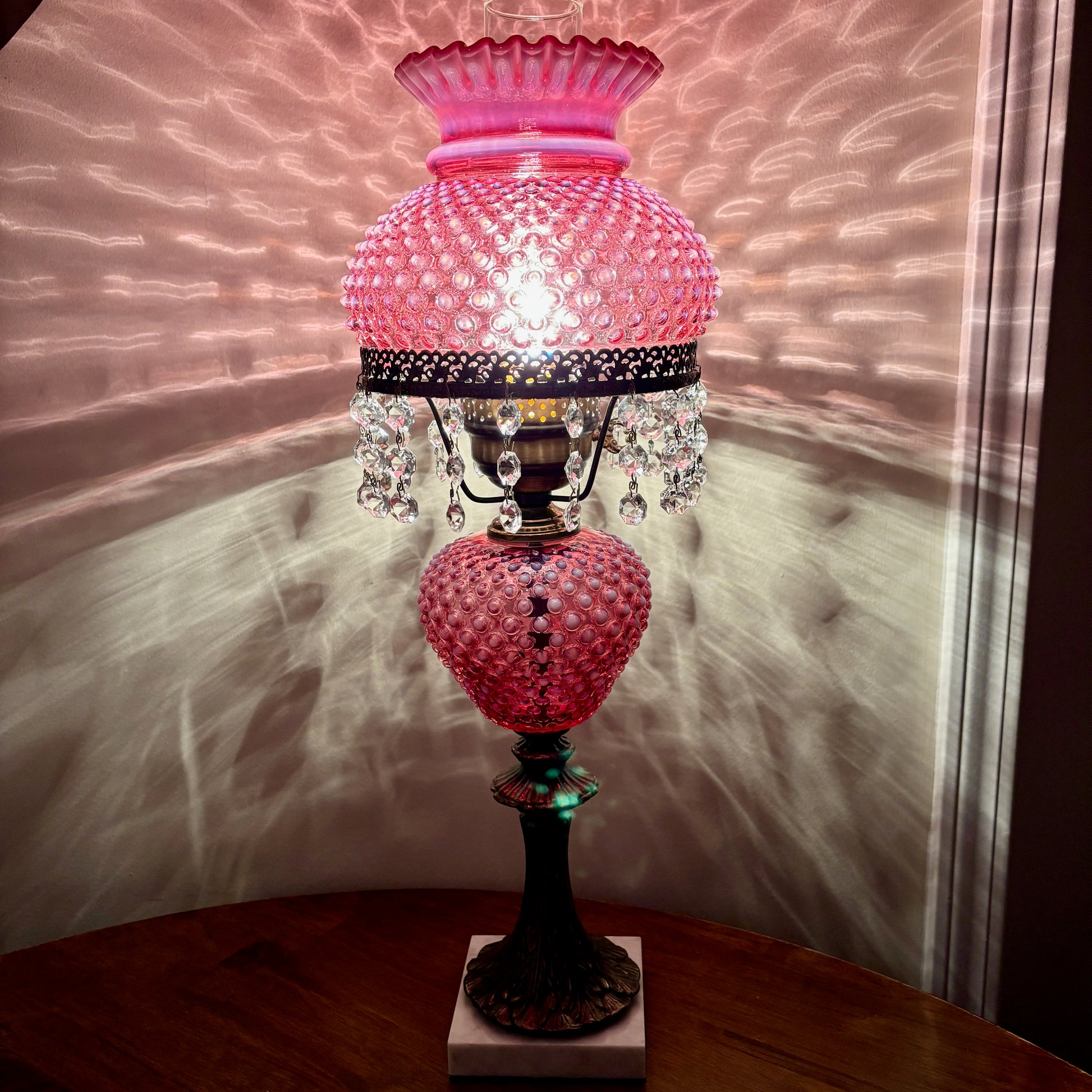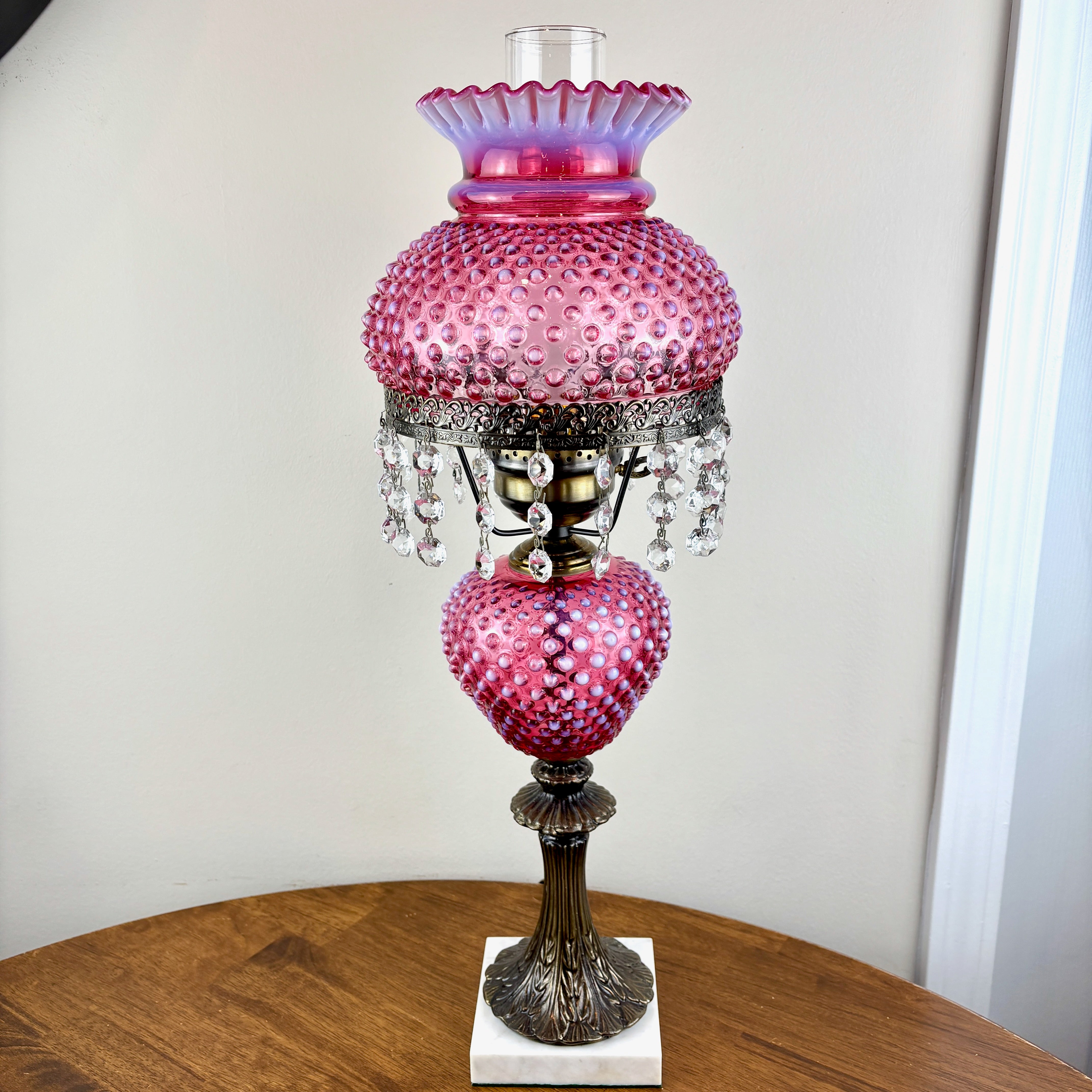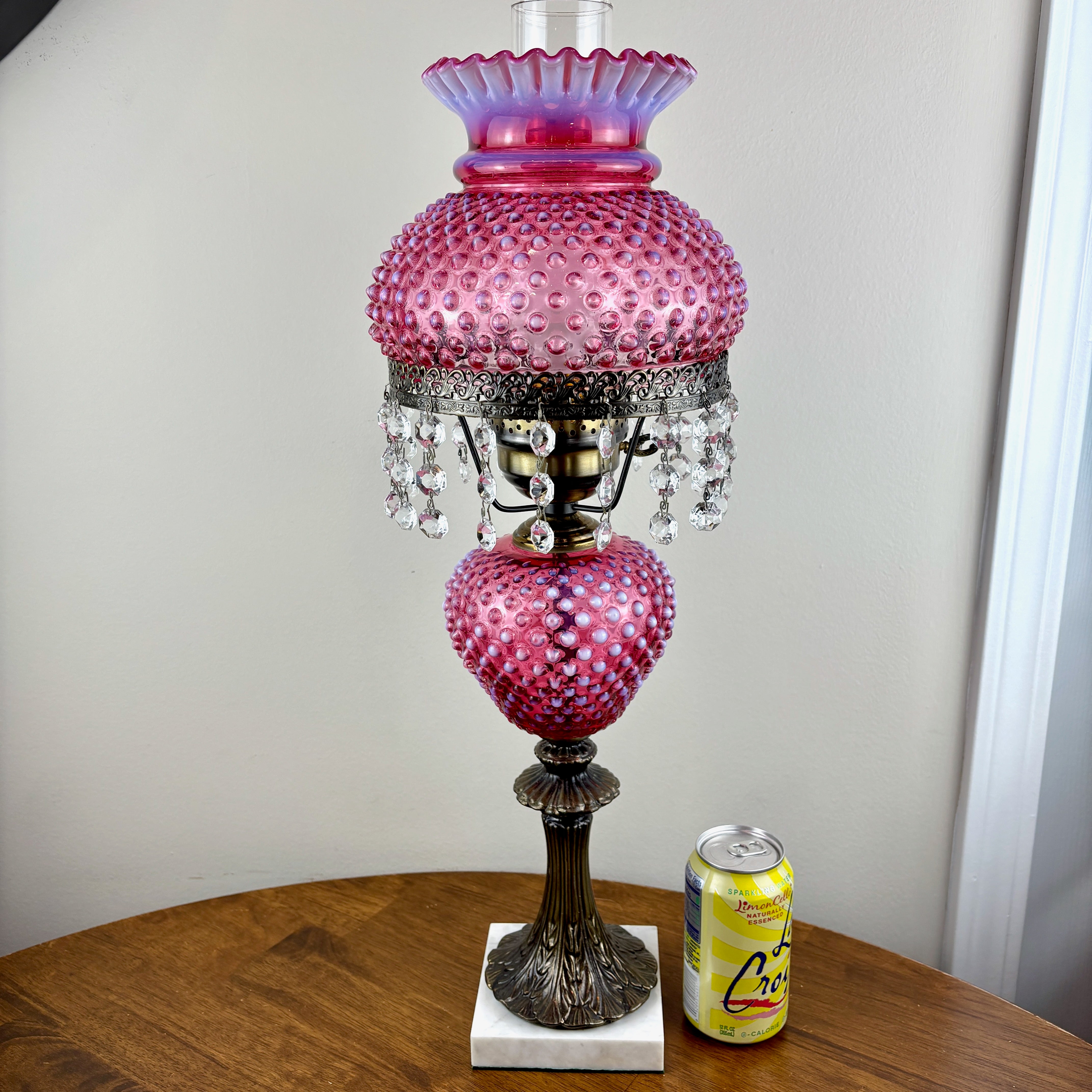 Vintage Fenton Cranberry Opalescent Hobnail Hurricane Lamp Marble Base Crystal Prism | Gone With The Wind Lamp | Fenton Lamp