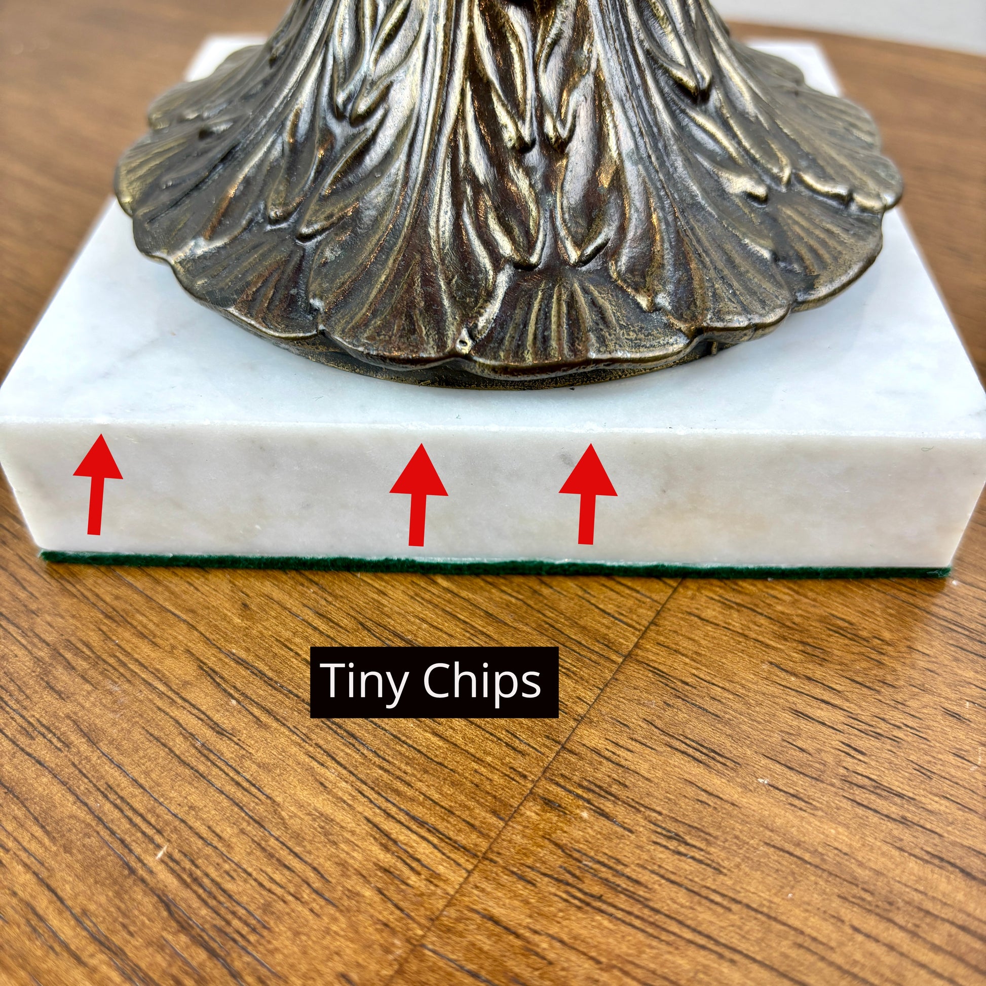 This lamp is in great vintage condition. The glass shade has some tiny light scratches, but the scratches can't be seen unless you're right next to the lamp. The bottom inside rim around the shade has chipping, but there are no chips on the outside rim of the shade. The marble base has tiny chips. Metal has light patina. Please see the last 3 photos for some examples of wear.