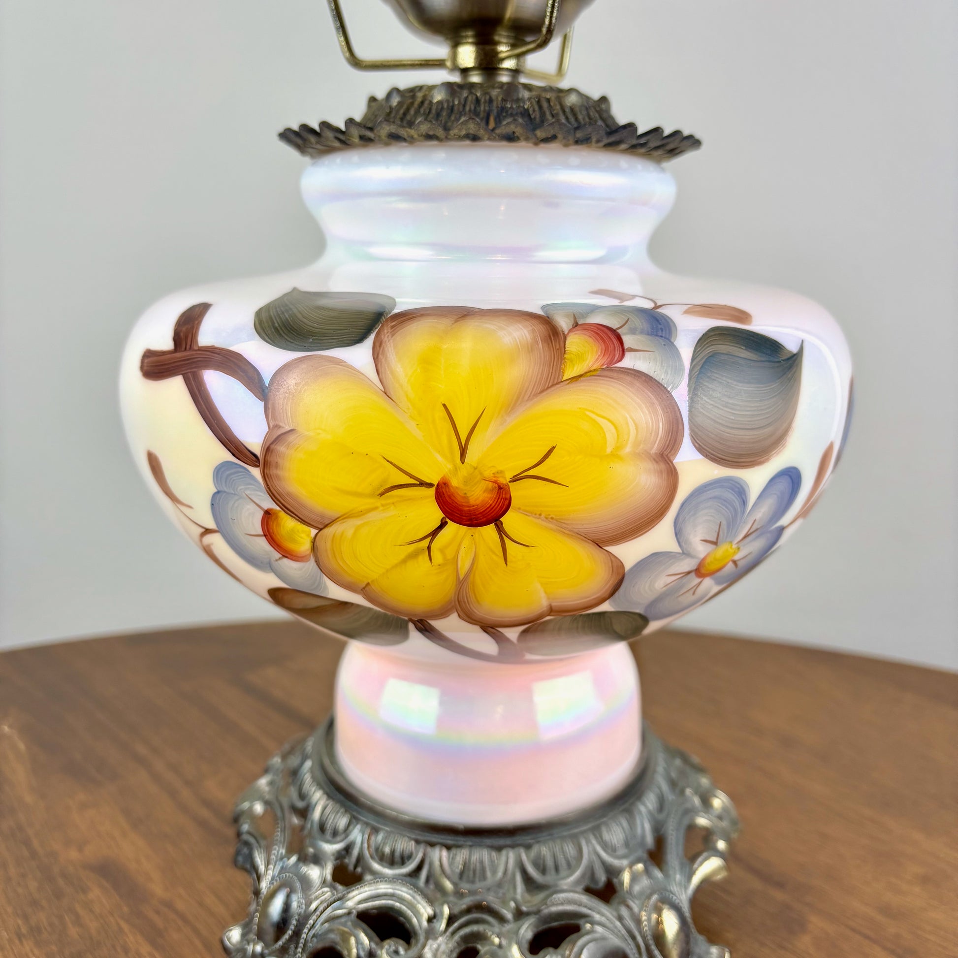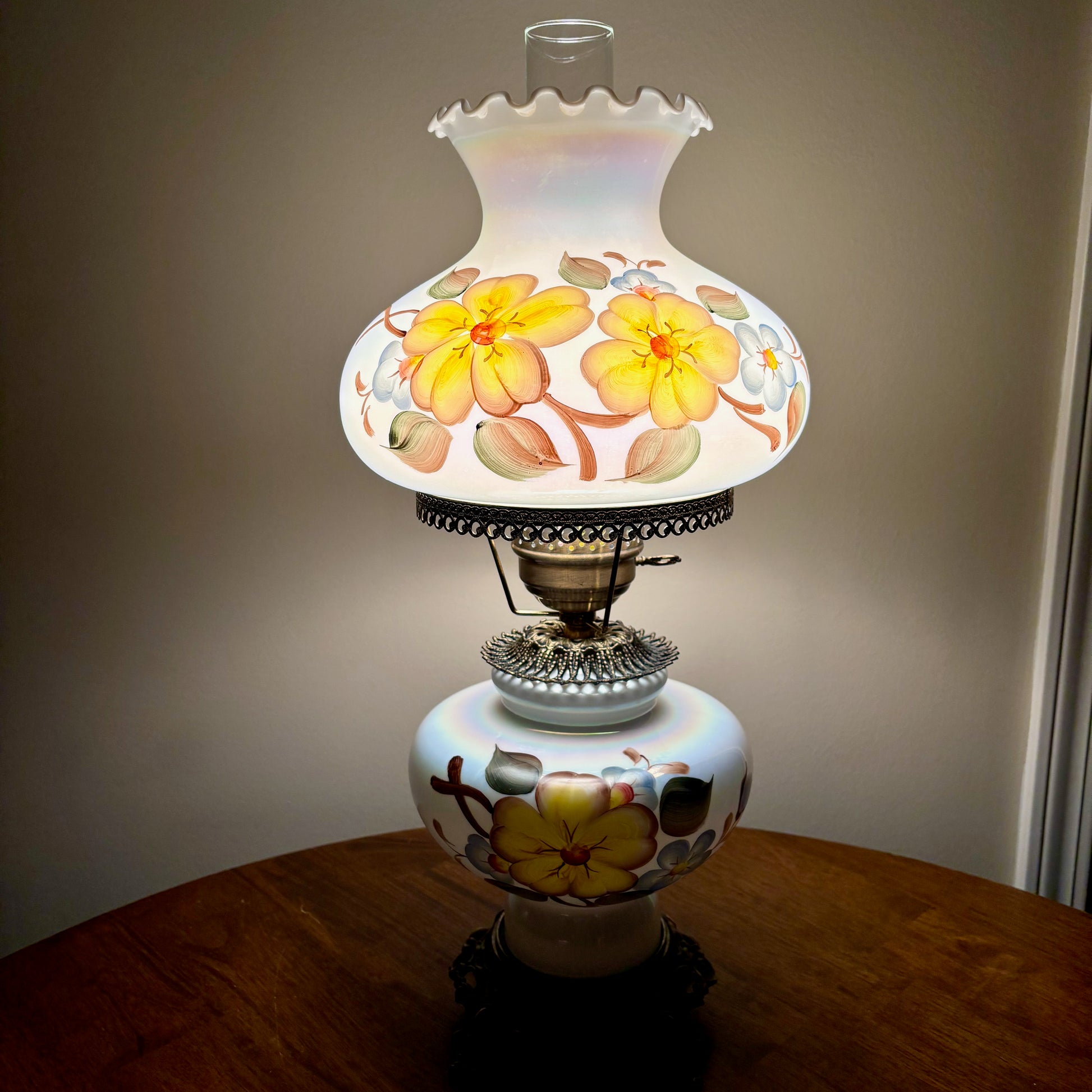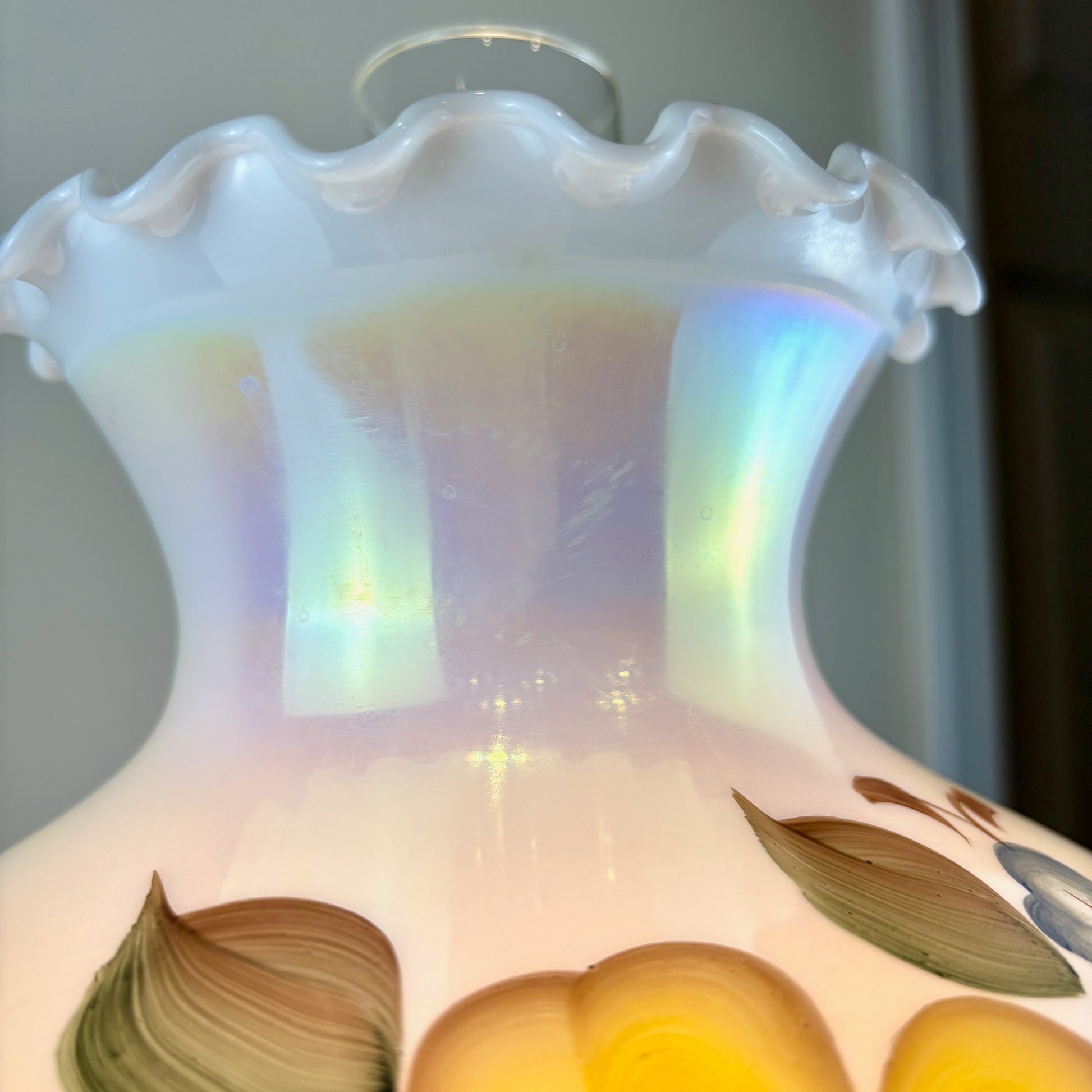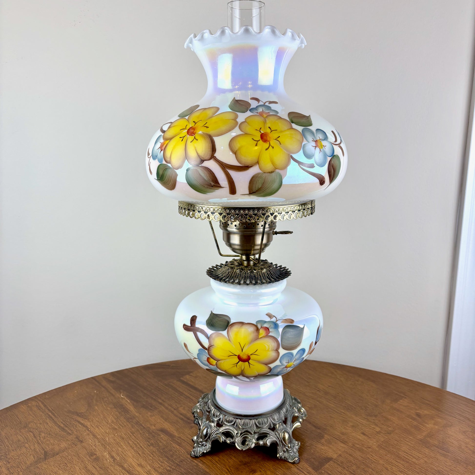 Gorgeous milk glass opalescent luster finish with yellow and blue flowers hurricane lamp.