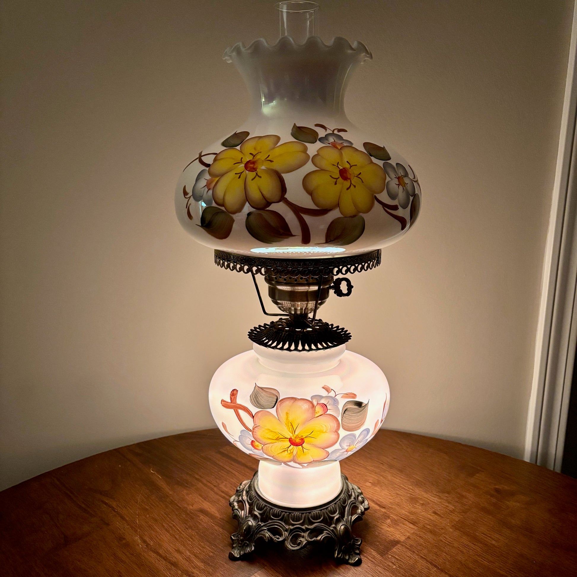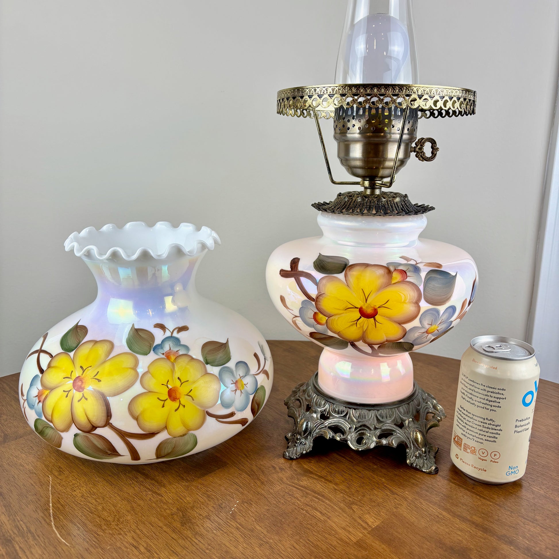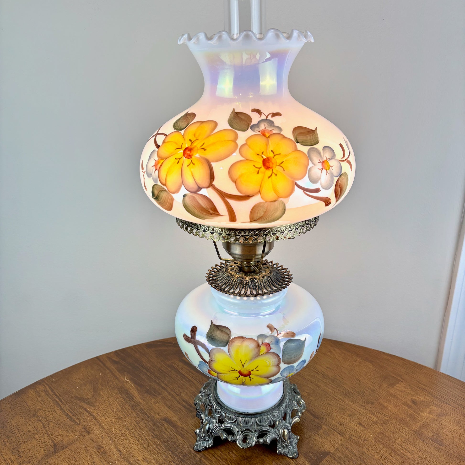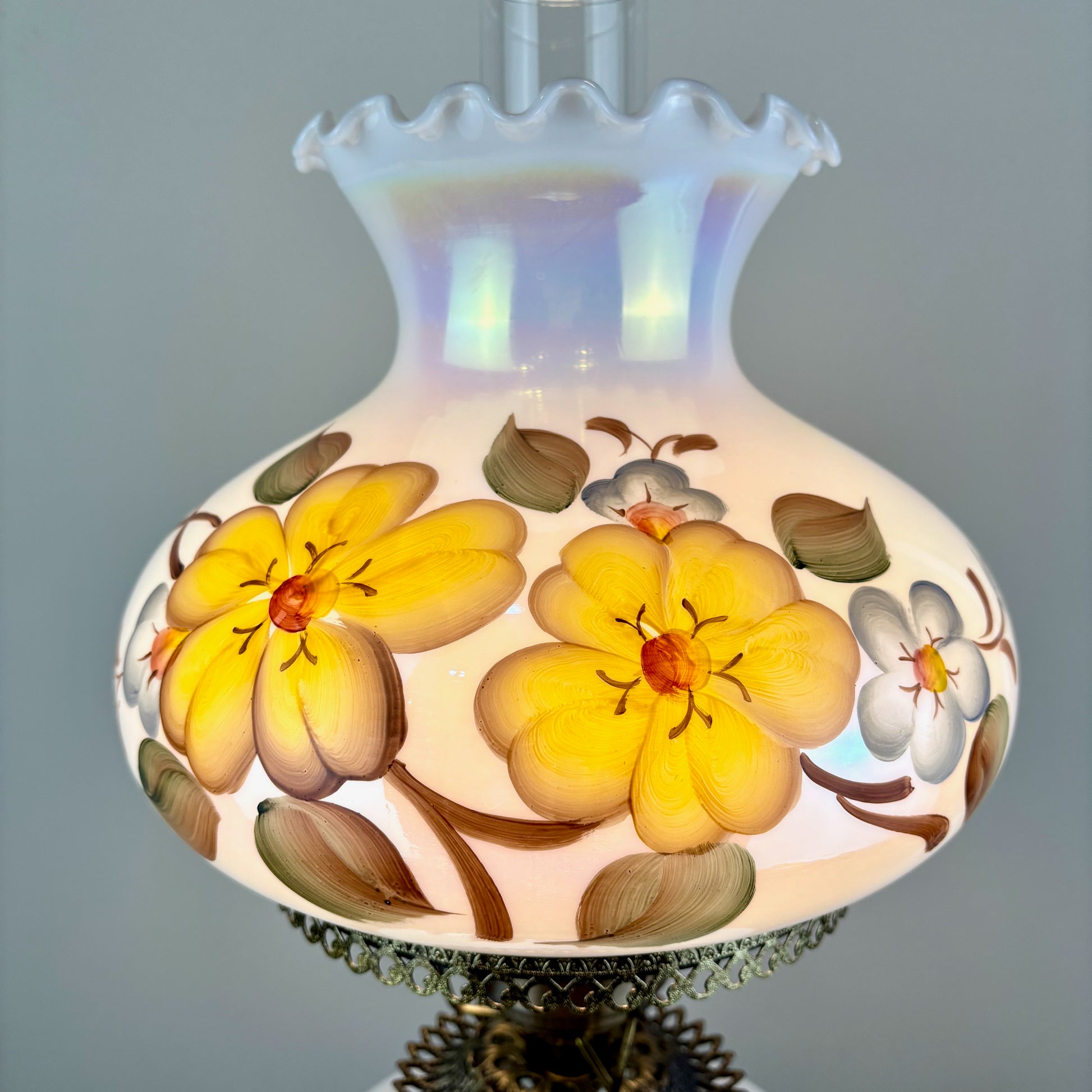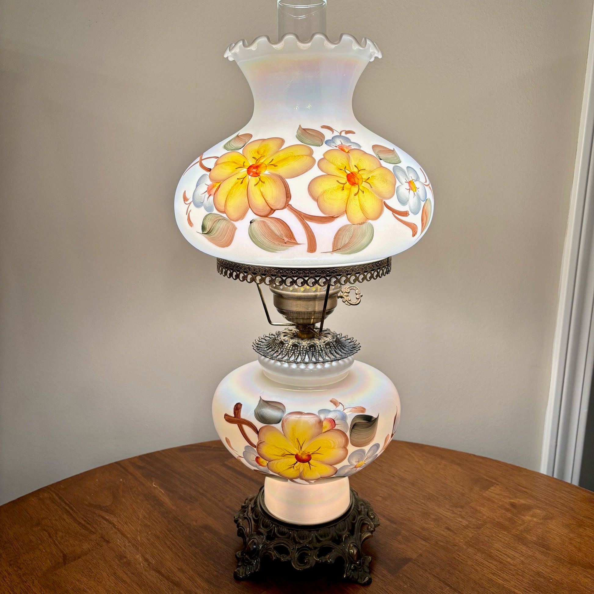 Gorgeous milk glass opalescent luster finish with yellow and blue flowers hurricane lamp.