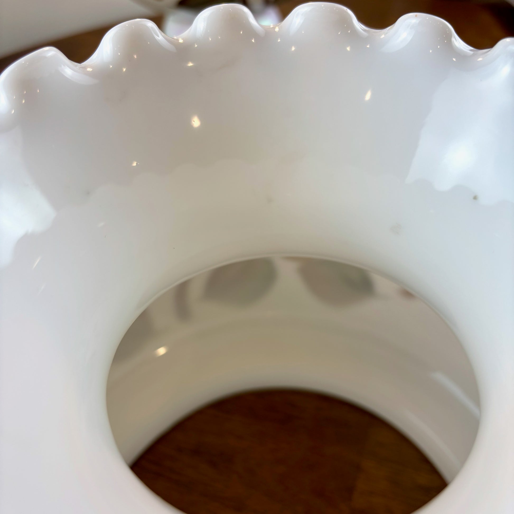 This lamp is in good vintage condition with no chips or cracks. The lamp has some marks in the paint close to the top ruffles of the shade and paint marks inside the shade. The marks in the glass can't be seen unless you're right next to the lamp. Metal has light patina. Please see the last 2 photos for some examples of wear.