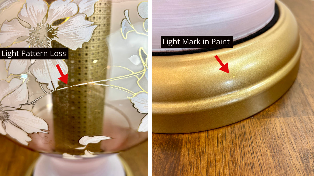 This lamp is in great vintage condition with no chips or cracks. The lamp has light pattern wear and a tiny mark in the paint on the base. The glass has air bubbles. Please see the last photo for some examples of wear.